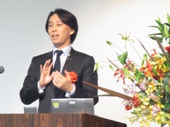 雪で新幹線が遅れて、会場に到着してすぐに壇上へ上がって講演されました。